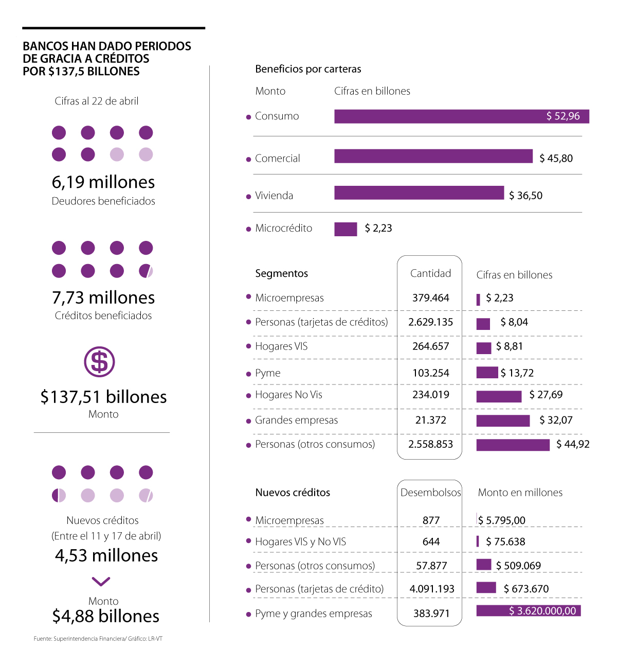Simultáneamente, la Superintendencia Financiera reveló que, al 22 de abril, 6,19 millones de deudores del sistema financiero recibieron periodos de gracia por un saldo de cartera de $137,51 billones.