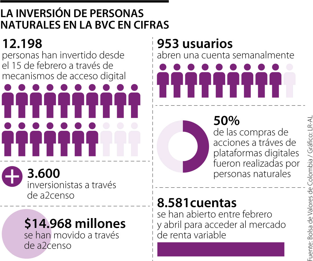 Entre febrero y abril, más de 12.198 personas naturales han invertido y comprado acciones en la Bolsa de Valores de Colombia (BVC) a través de plataformas digitales y las tasas de retorno de la deuda colaborativa de a2censo.