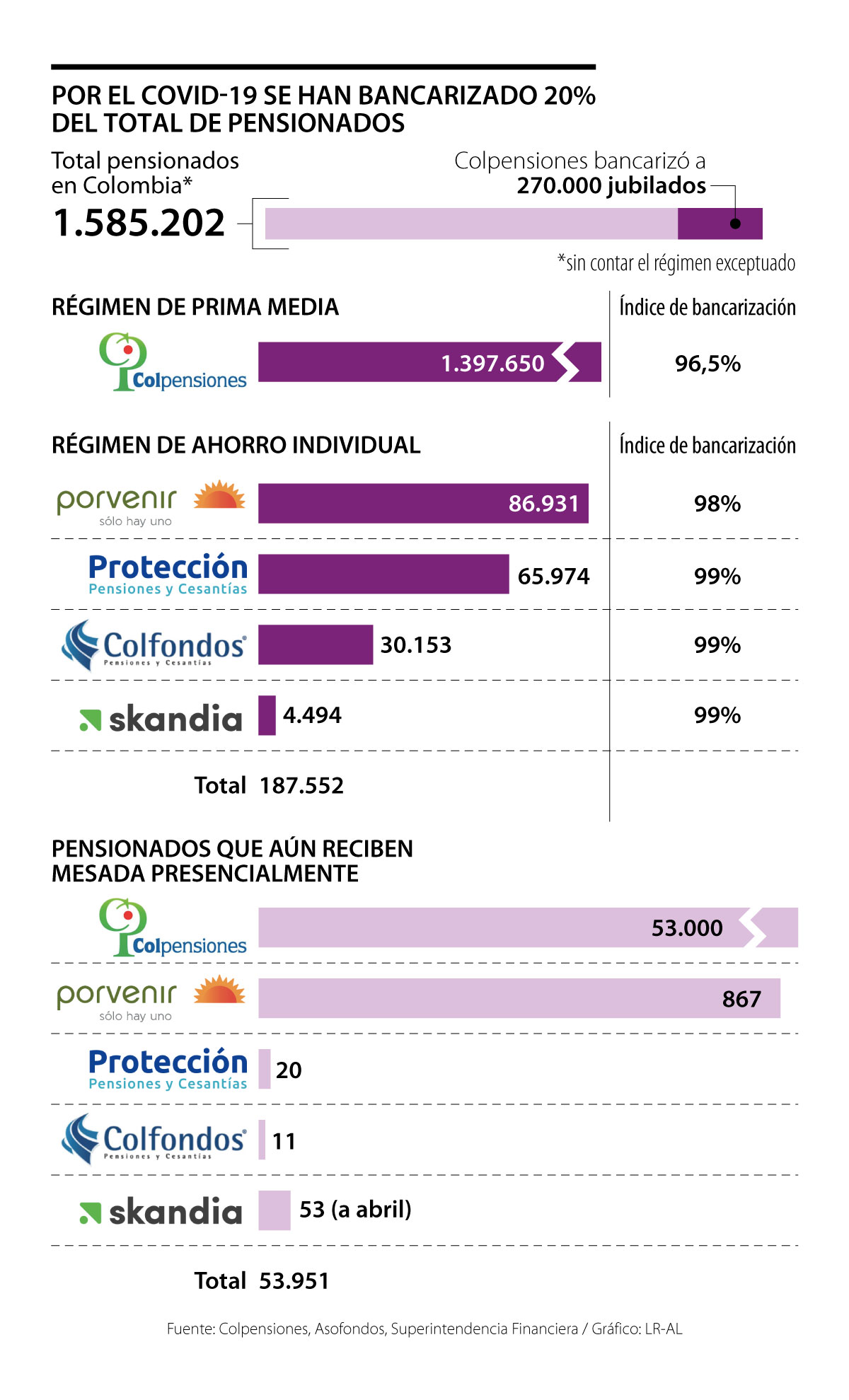 En Protección, de 65.974 jubilados, un promedio de 20 aún reciben su mesada a través de un cheque en una oficina. Colfondos tiene 30.153 pensionados y solamente 11 reciben su mesada de forma presencial porque tienen problemas judiciales con sus cuentas; y, a abril, Skandia contaba con solo 53 no bancarizados.