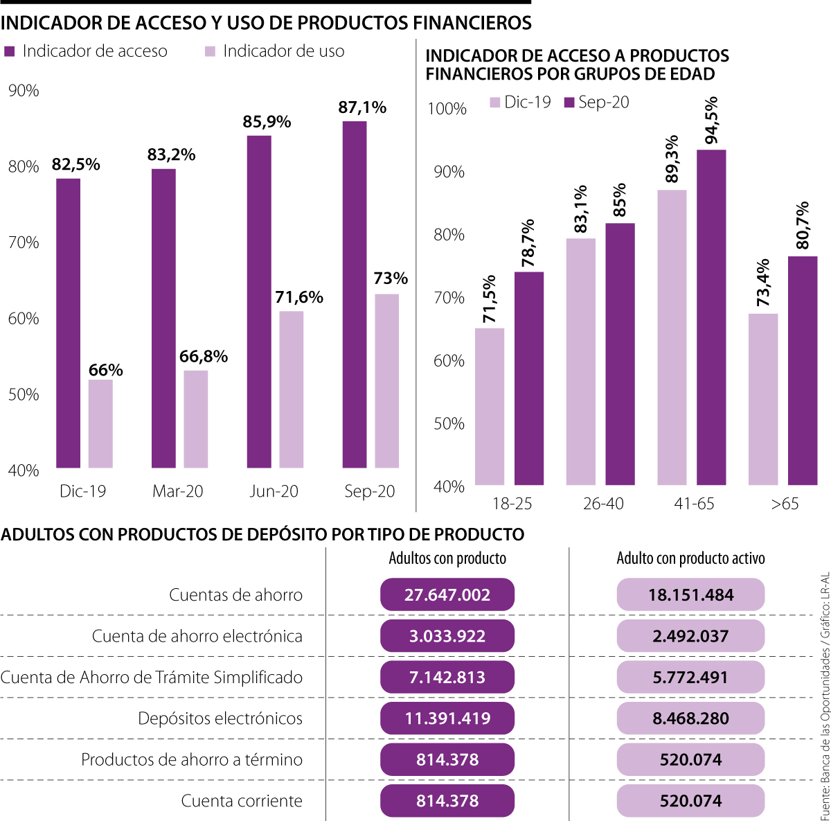 En el reporte de ‘Inclusión Financiera’ también se refleja que la crisis desatada por la pandemia generó un impacto positivo en el indicador de uso de los productos del sistema financiero, ya que este pasó de estar en 71,6% a 73% entre junio y septiembre de 2020, es decir que 26,5 millones de adultos tenían activo al menos uno de sus productos financieros.