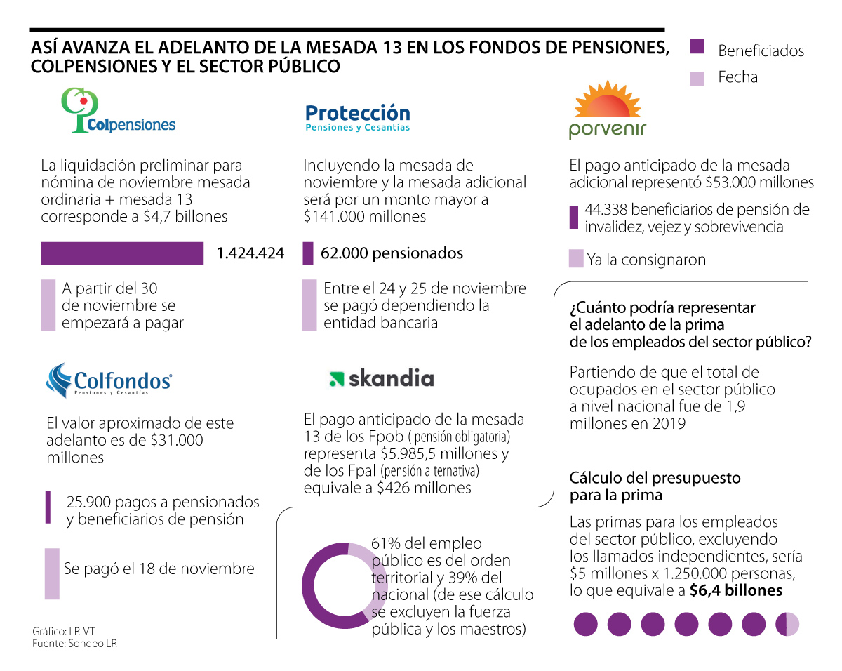 Con el fin de contribuir a la reactivación económica en medio de la actual crisis, Colpensiones y las cuatro Administradoras de Fondos de Pensiones (AFP): Colfondos, Skandia, Porvenir y Protección anunciaron que adelantarán el pago de la mesada 13 para los pensionados, lo cual beneficia a más de 1,5 millones de personas.