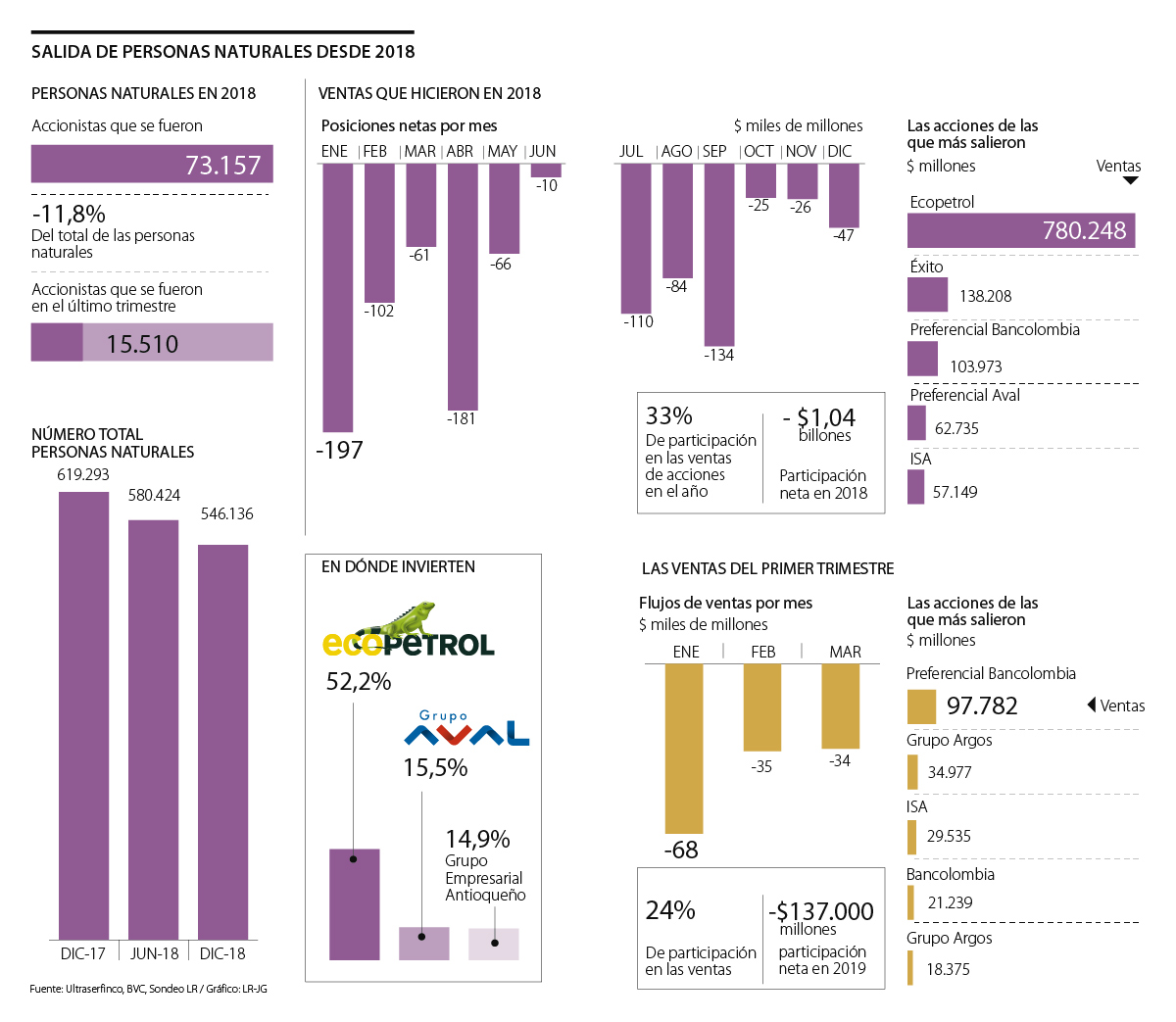 Durante el último trimestre del año fueron 15.510 accionistas personas naturales los que salieron de sus posiciones; mientras que en entre enero y marzo de 2019, el balance entre compras y ventas da un indicio de la continuidad del fenómeno.