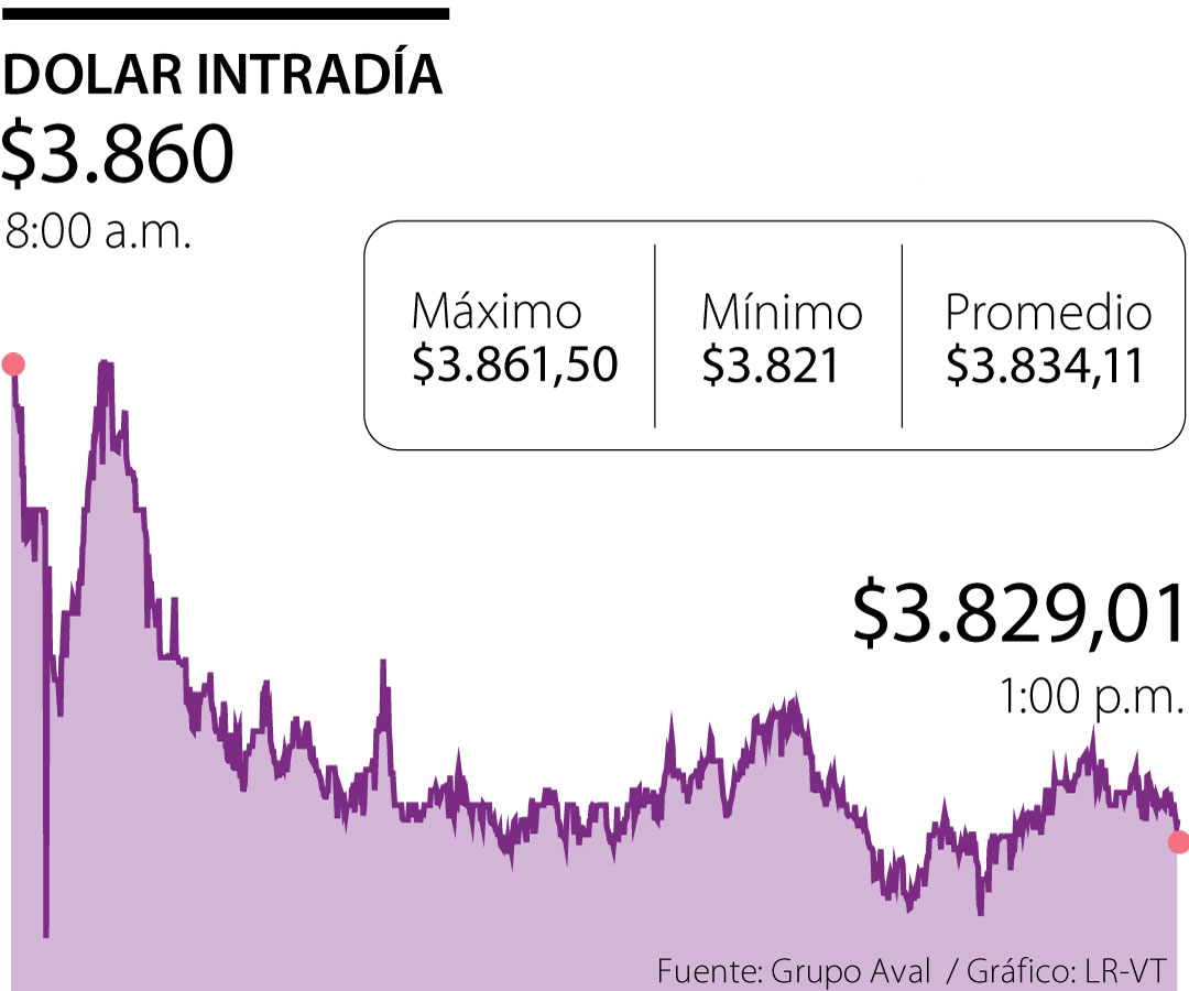 Ayer el dólar cerró con un precio promedio de negociación de $3.834,11, lo que representó una caída de $36,46 frente a la Tasa Representativa del Mercado (TRM), que para la jornada se ubicó en $3.870,57.
