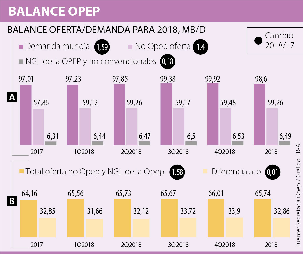 Este aporte, sumado al de Brasil, Reino Unido y Canadá, y otros suministros ajenos a la Opep, subirán hasta los 59,26 mbd la oferta por fuera del cartel; que significa 1,40 mbd más que los producidos durante 2017.