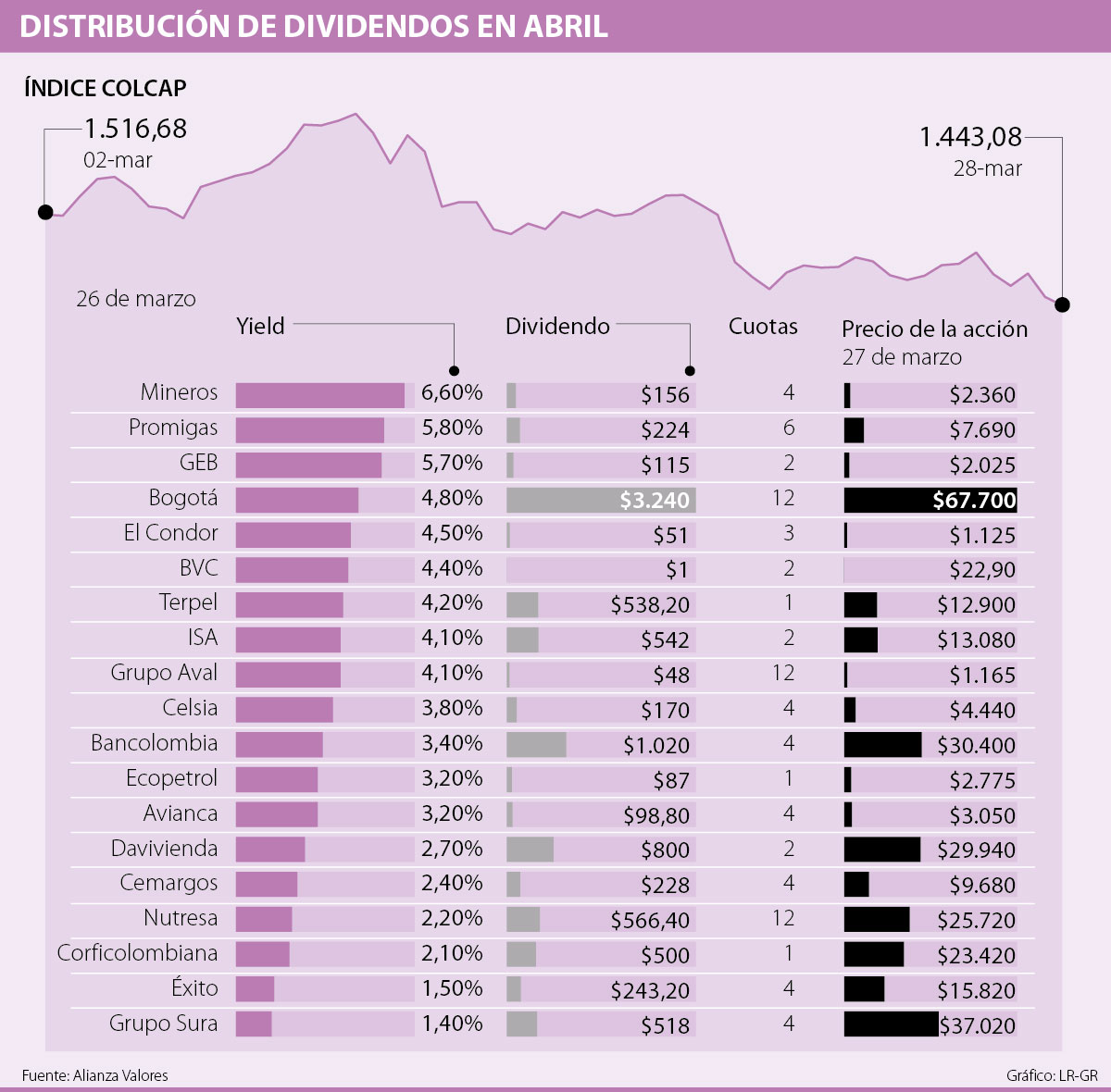 Por el lado de Promigas, que se cotiza en bolsa a $7.690 por acción, cabe mencionar que estará repartiendo $224 por unidad. En este caso, el pago se hará el 21 de cada mes, desde abril hasta septiembre. En el último mes, se pagarán $139.