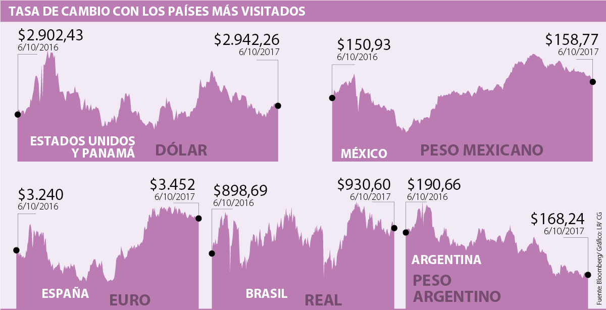 Por último, el peso argentino ha caído 11,7% frente a la moneda local. Hace un año, costaba $190 y ahora está en $168, los últimos meses han llegado malos reportes de empleo y déficit comercial. Sin embargo, pese a que es el país con mejores condiciones en la tasa de cambio, la inflación llegó a 25,9%, por lo que los precios de alimentos, hospedajes y diferentes productos continúan altos.