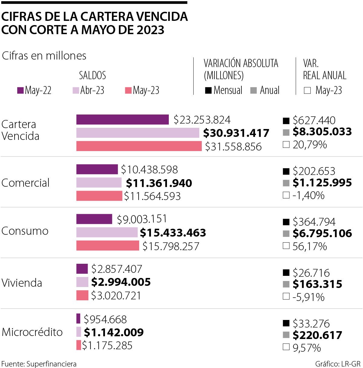 La cartera vencida, en general, para mayo de 2023, quedó en $31,5 billones, y para el mismo mes del año pasado estaba en $23,2 billones, lo que representa un incremento de 20,79% en un año.