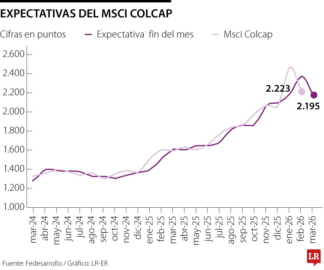 Al cierre de febrero, el índice se ubicó en 2.223 puntos, 157 unidades por debajo de la expectativa de los analistas (2.380). De acuerdo con el más reciente boletín de Fedesarrollo sobre indicadores de confianza del mercado de renta variable, se prevé que para el cierre de marzo el Colcap se sitúe alrededor de 2.195 puntos como respuesta mediana, dentro de un rango estimado entre 2.133 y 2.215.