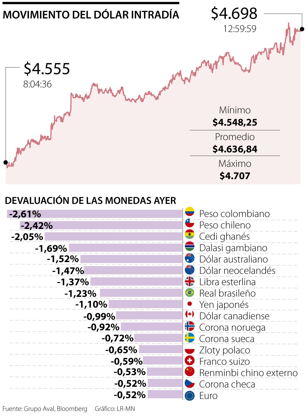 A pesar de que la jornada de ayer inició a la baja, el dólar volvió a repuntar e incluso superó los $4.700 en el intradía, tocando un máximo de $4.707 y un mínimo de $4.548,25, con una diferencia de $158,75 lo que demuestra la alta volatilidad.