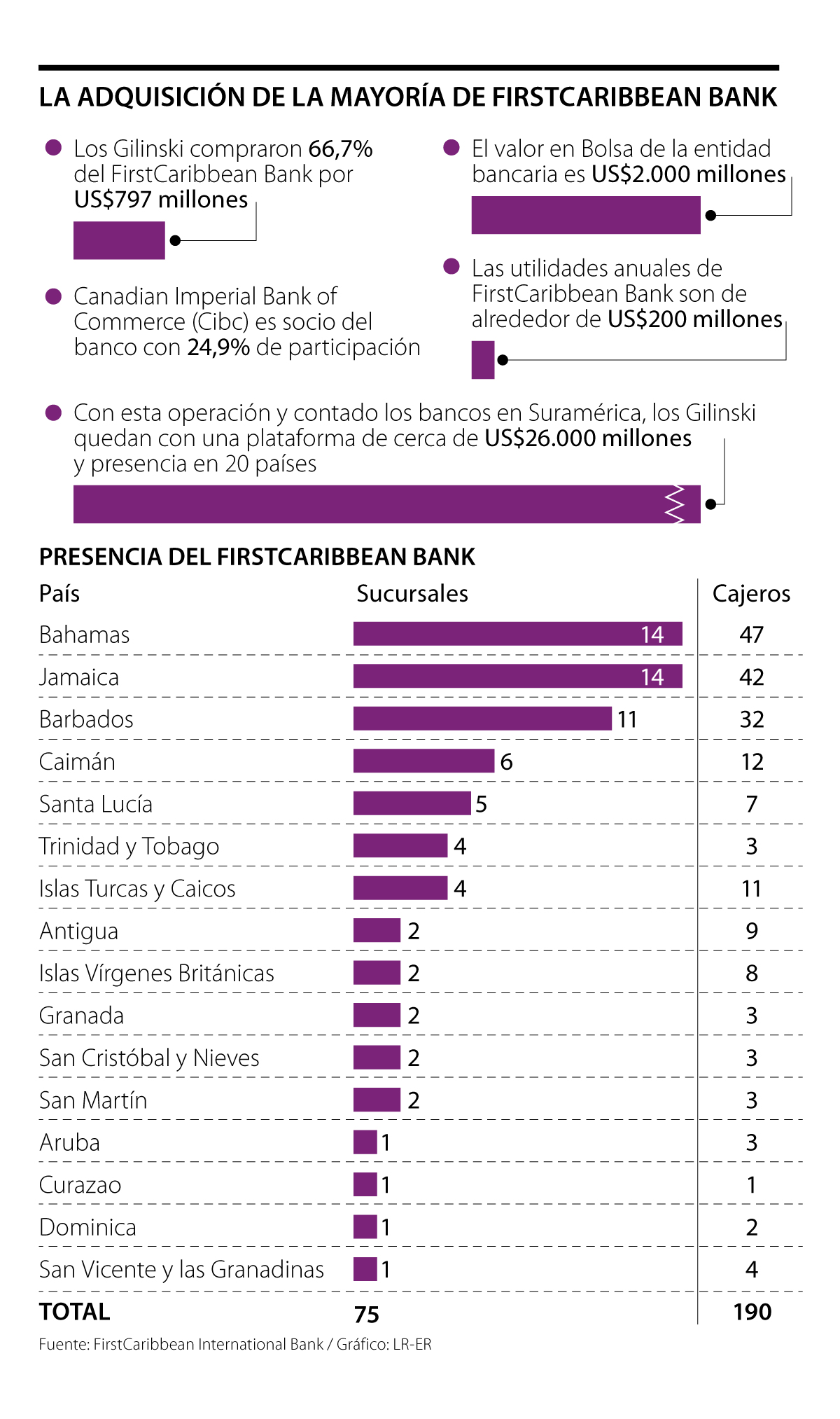 El GNB Financial Group Limited, sociedad del Grupo Gilinski llegó a un acuerdo con el Canadian Imperial Bank of Commerce (Cibc), el accionista mayoritario del FirstCaribbean Bank, para comprar 66,73%, por US$797 millones, de la participación en la entidad bancaria que tiene presencia en 16 países del Caribe.