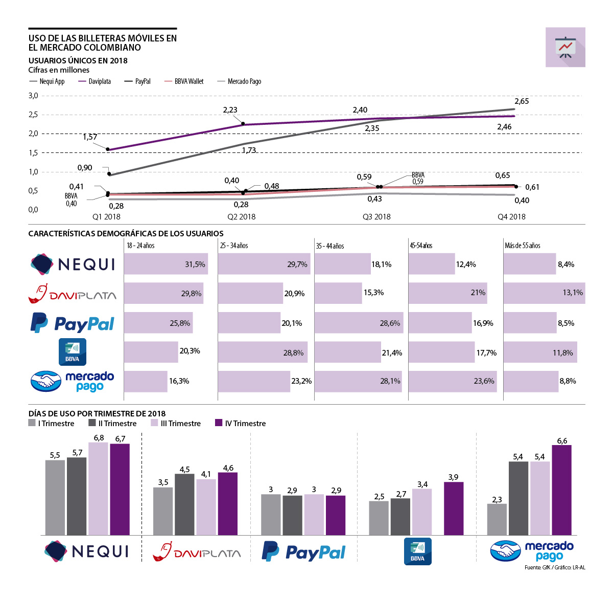 La información se obtuvo de GfK Crossmedia Visualizer, un panel comportamental de GfK en el que participan 6.000 personas que tienen instalado un software en sus dispositivos tecnológicos. Por medio de este se miden los sitios web visitados, las apps instaladas y su tiempo de uso. Con estos datos se hace una muestra representativa que se extrapola a toda la población de internet, que según las cifras del Dane, es de 20 millones de personas. Para este estudio se tuvo en la cuenta que usaran la billetera móvil y no que solo la tuvieran instalada.