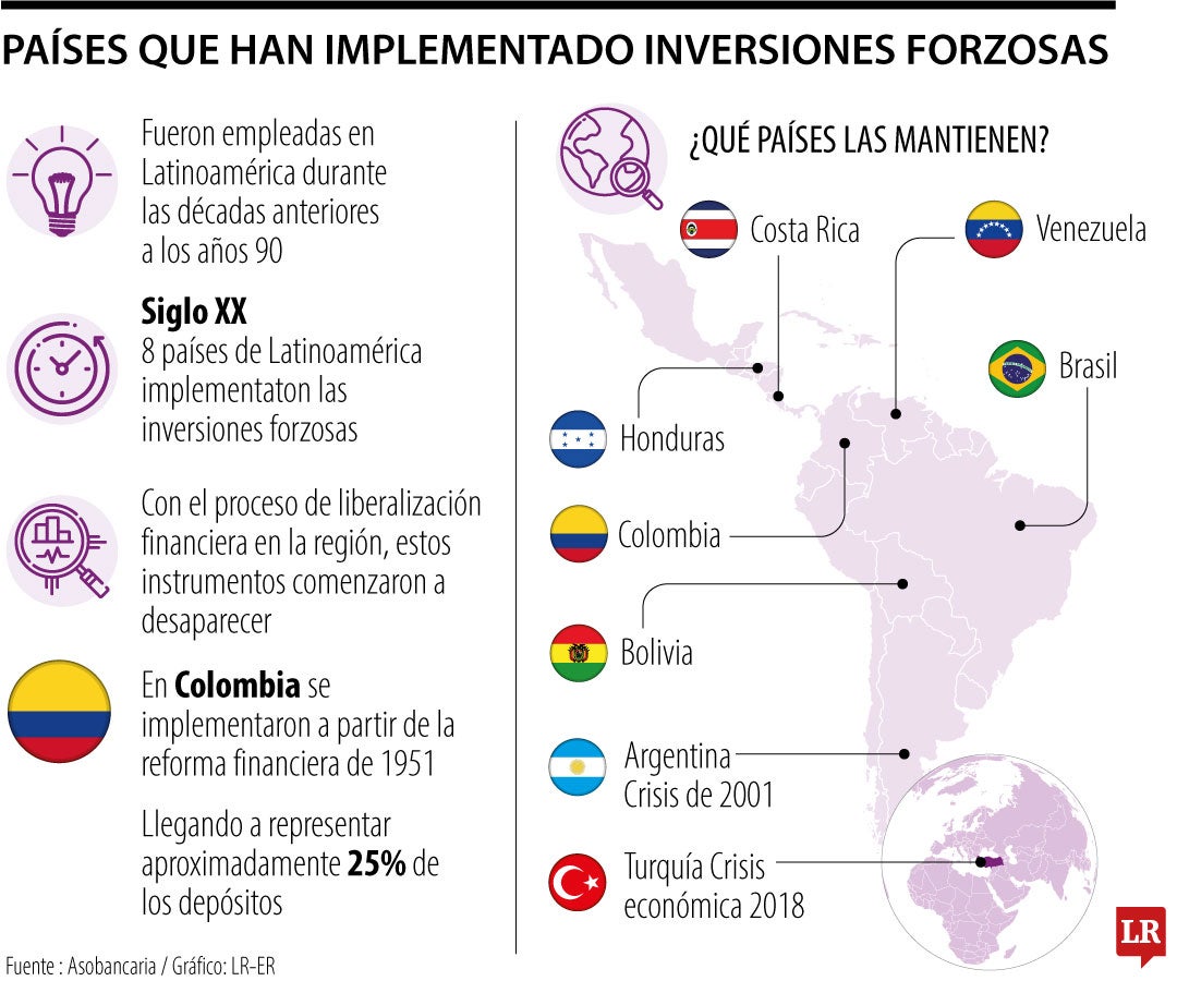En Colombia, las inversiones forzosas también se implementaron a partir de la reforma financiera de 1951, llegando a representar aproximadamente 25% de los depósitos.
