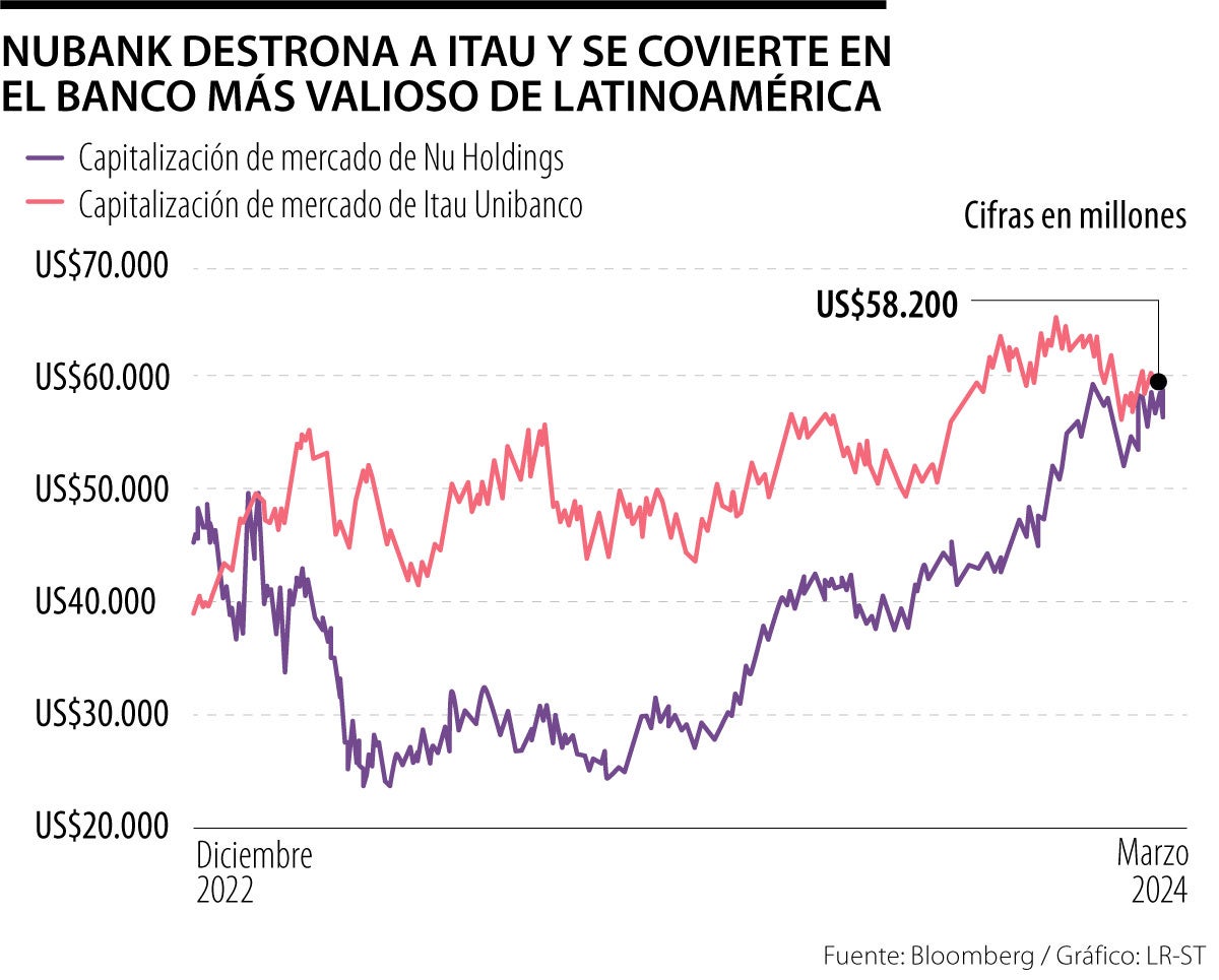 Nu Holdings Ltd., el banco digital brasileño que ha estado luchando contra los prestamistas tradicionales durante la última década, superó a Itaú Unibanco Holding SA como la institución financiera más valiosa de América Latina.