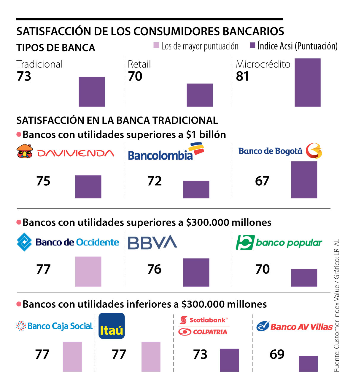 Cabe mencionar que por primera vez en esta medición se incluyeron otros dos segmentos de la banca, además del tradicional. Estos son el de retail y el de microcrédito. El índice Acsi para el primero fue de 70, mientras que para el segundo fue de 81.