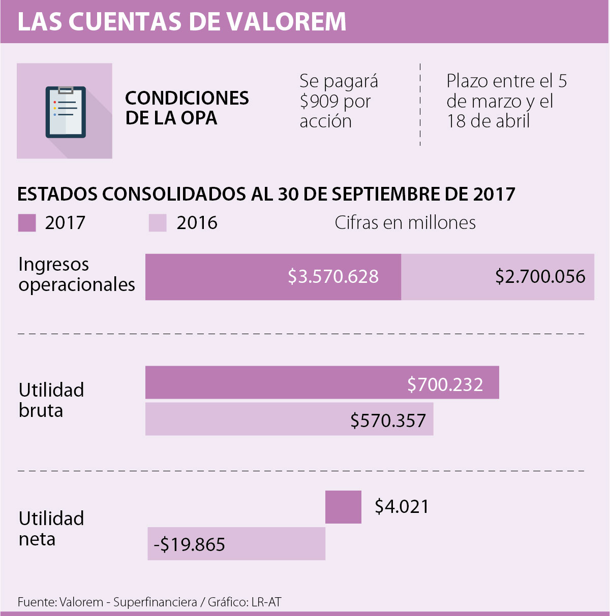 Cabe recordar que recientemente, al cierre del tercer trimestre del año pasado, Valorem había presentado unos ingresos operacionales de $3,5 billones (en el mismo periodo de 2016 habían sido de $2,7 billones); una utilidad bruta de $700.232 millones, y una ganancia neta de $4.021 millones, cuando entre enero y septiembre del año anterior había dado pérdidas por $19.865 millones.