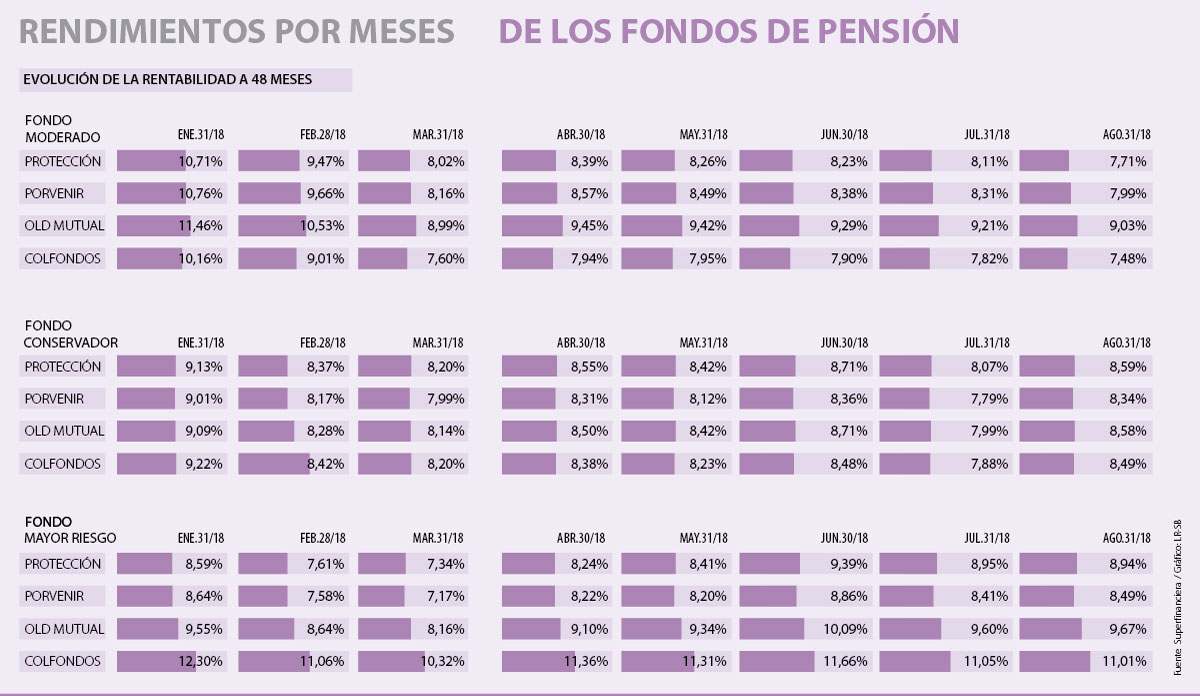Ahora, este liderazgo no pasa en todos los fondos, ya que en el conservador la entidad de pensiones Protección es la que tiene la mayor rentabilidad con 8,59%, sin embargo, Old Mutual está muy cerca al ofrecer una rentabilidad de 8,58%. En el tercer puesto está Colfondos que ofreció, a agosto, una rentabilidad de 8,49% y, finalmente, Porvenir con 8,34% según los datos de la Superfinanciera.