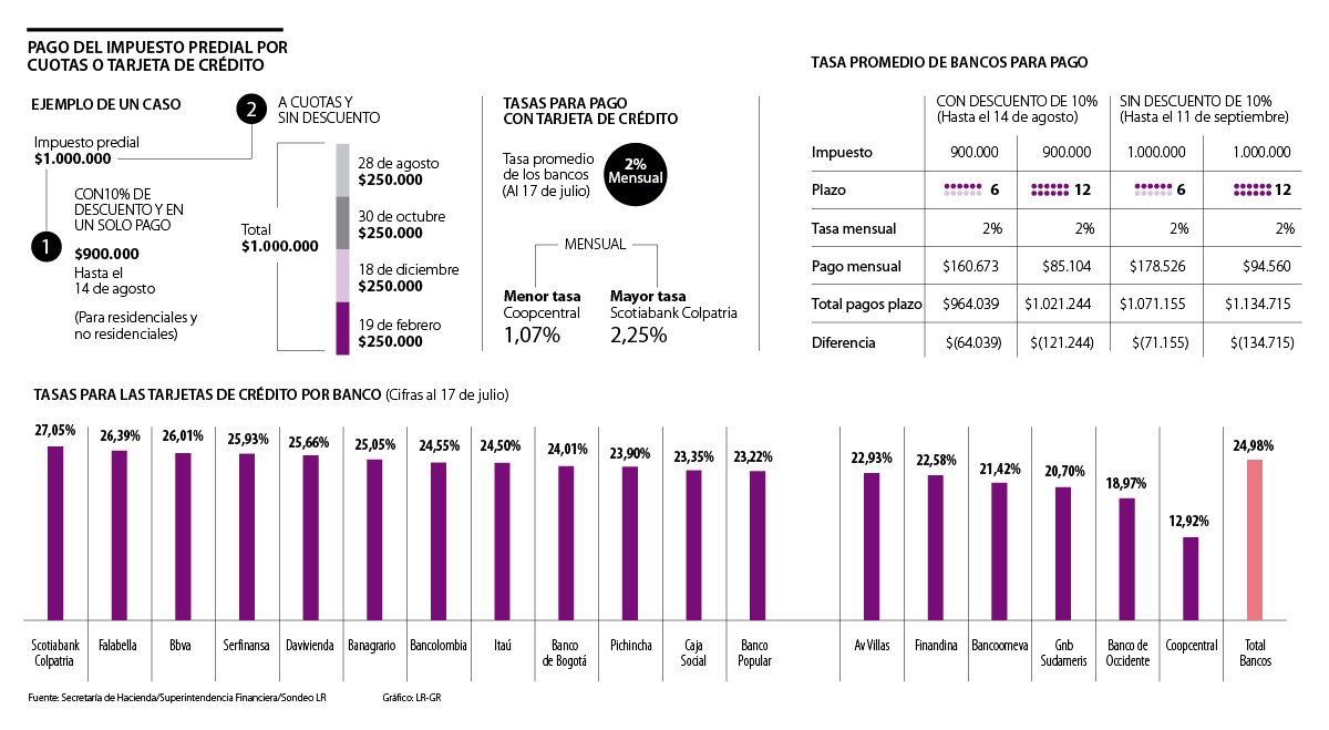 Sin embargo, debido a la coyuntura, muchas personas no tendrán la capacidad de saldar esta obligación en una sola cuota. Por eso, LR le explica qué tan positivo es optar por una financiación a través de una tarjeta de crédito con un banco y pagar antes de este 14 de agosto para recibir el descuento de 10% por parte del Distrito o, en su defecto, sin esa rebaja hasta el 11 de septiembre.