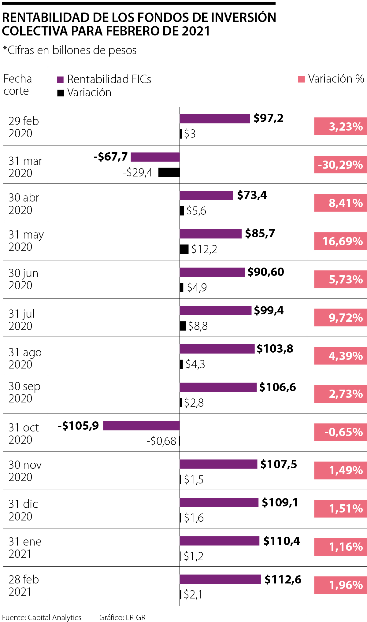 Capital Analytics, la fintech colombiana que ofrece servicios de información y análisis de instrumentos de inversión, reveló, en su último estudio, que la rentabilidad de los Fondos de Inversión Colectiva (FIC) para febrero de 2021 fue de $112,6 billones, lo que equivale aproximadamente a 10% del Producto Interno Bruto y representa un crecimiento anual de 15,8%. Además, frente al mes inmediatamente anterior, aumentó 1,96%, es decir, $2,1 billones.