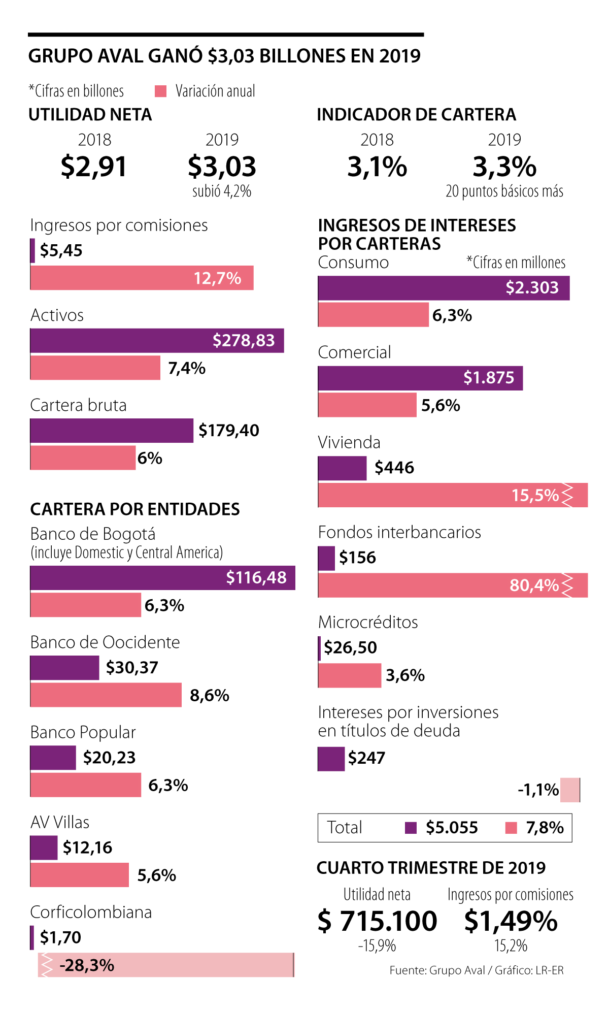 Sin embargo, durante el último trimestre de 2019, el Grupo Aval presentó una reducción de 15,9% en sus utilidades al obtener $715.100 millones. Frente a estos números, el gerente de renta variable de Ultraserfinco, Carlos Rodríguez, explicó que el dato negativo en ese periodo se debió a la reducción en los ingresos de Corficolombiana.