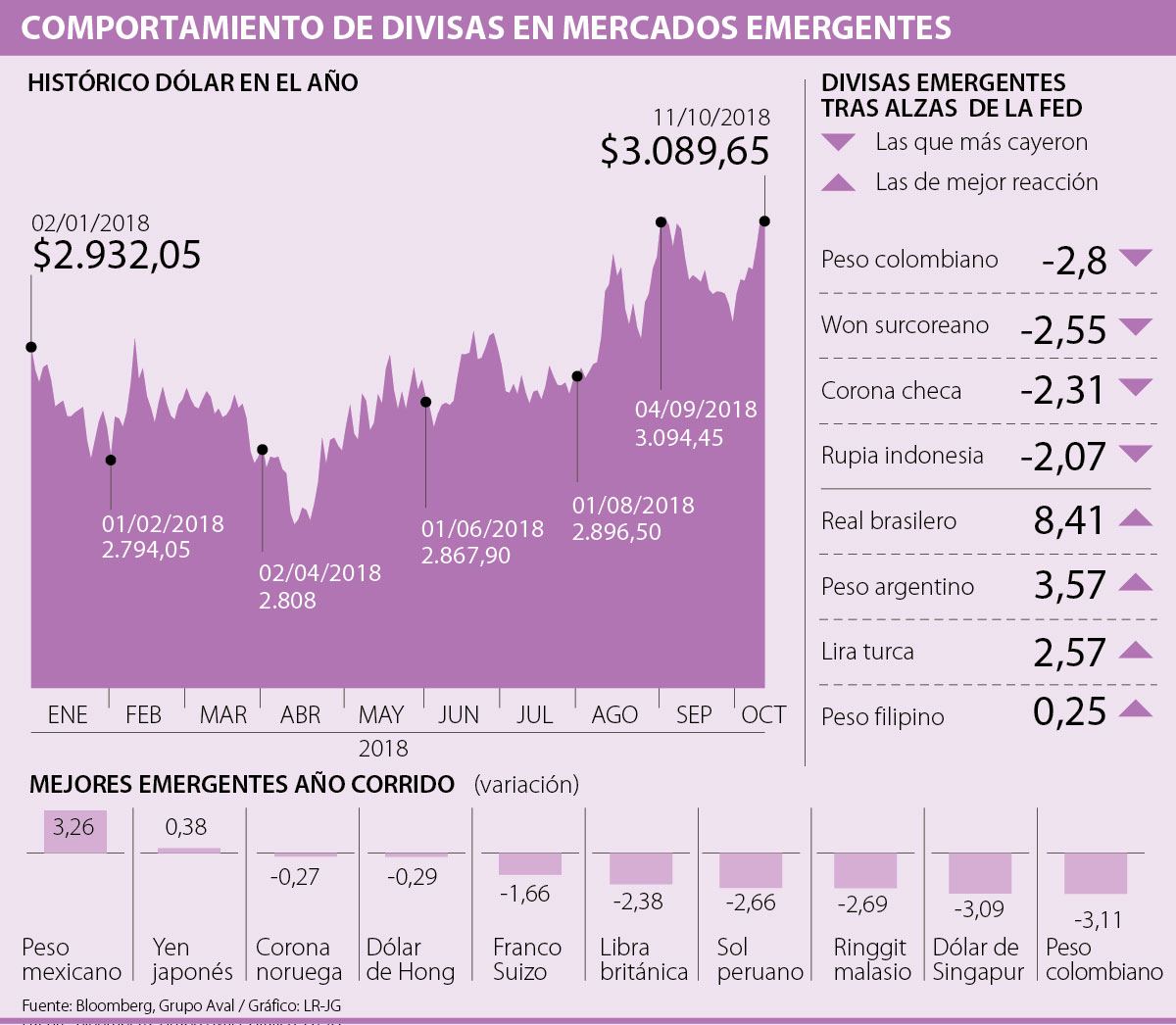 El agite de las bolsas ha impactado con mayor fuerza en el mercado de divisas y en este sentido el peso colombiano ha sido la moneda más afectada entre las emergentes con una caída de 2,8% desde la subida de tasas (ver gráfico).