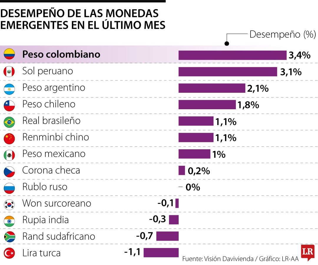 Un análisis de Visión Davivienda reveló que el peso colombiano superó a sus pares en el último mes. La moneda tuvo una apreciación de 3,4% en los últimos 30 días y estuvo por encima de otras divisas como el sol peruano (3,1%); el peso argentino (2,1%); el peso chileno (1,8%); y el real brasilero (1,1%). El desempeño del peso también ha sido destacable a lo largo del año al estar en tercer lugar en la región.