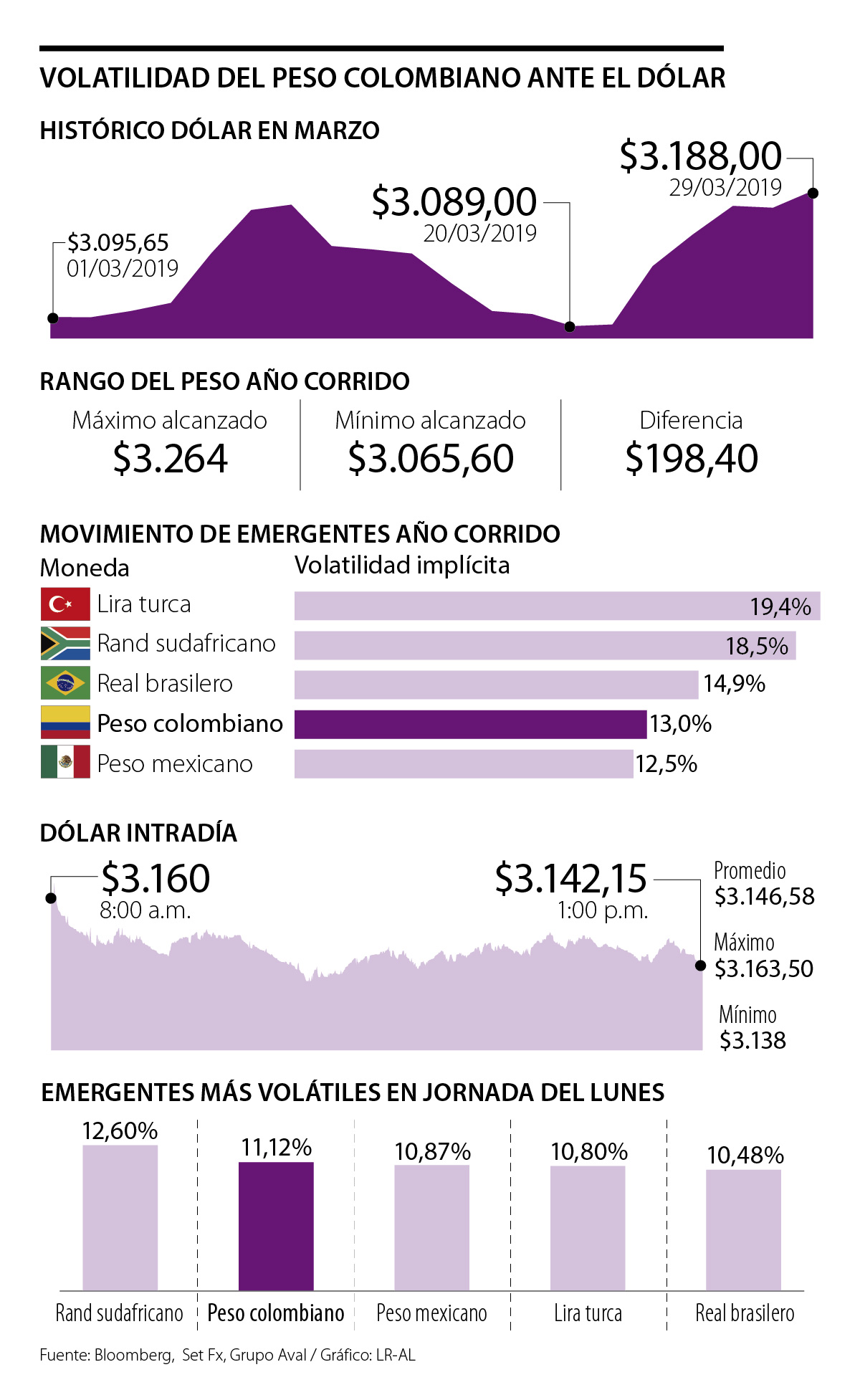 Estos bruscos movimientos del peso llevaron a que en el primer día de abril se ubicara como la segunda moneda emergente más volátil, con una fluctuación intradía de 11,12%, solo por debajo del rand sudafricano (12,65%). Y si se amplía el panorama y se revisa el comportamiento del primer trimestre, la moneda ha tocado un precio mínimo de $3.065,60 y un máximo de $3.264, un rango que lleva a que su volatilidad en pesos sea de $198,40.