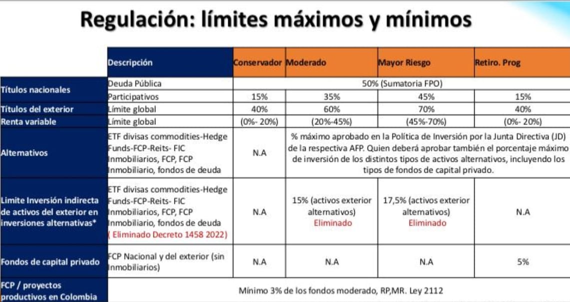 Según el Decreto 2555, Art. 2.6.12, los Fondos de Pensiones tienen una regulación que establece % máximo aprobado. En títulos del exterior, por ejemplo, las AFP pueden invertir hasta 70%, dependiendo del tipo de portafolio.