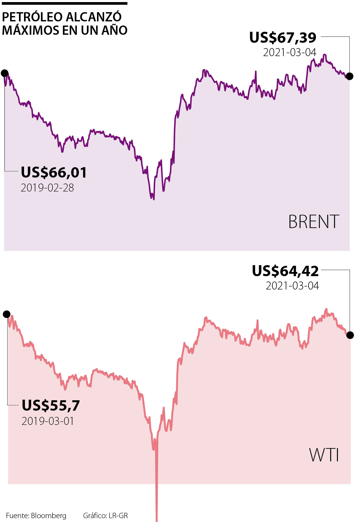 El Brent alcanzó una cotización de US$67,39, la última vez que la referencia del Mar del Norte llegó a un precio similar fue el 26 de diciembre de 2019. El West Texas Intermediate (WTI) llegó a una cifra de US$64,42, la última vez que esta referencia superó US$64 fue el 16 abril de 2019.