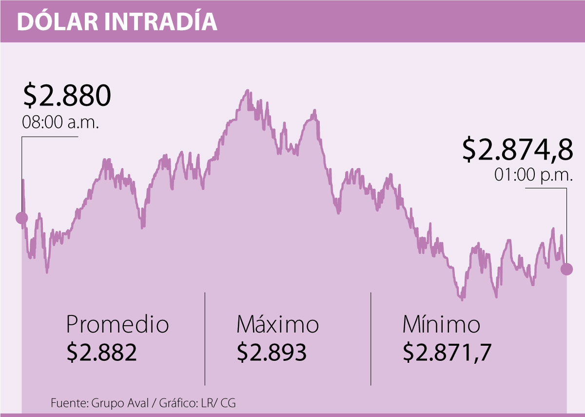 En cuanto a la divisa, esta cerró la jornada a un precio promedio de $2.882, lo que significó un leve incremento de $1,9 frente a la TRM que se ubicó en $2.880,1. En la sesión no hubo fuertes cambios y la moneda fluctuó entre un mínimo de $2.871,7 y un máximo de $2.893.