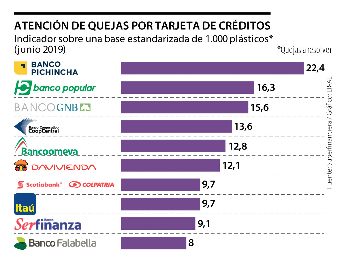 La evolución de este indicador la ha venido midiendo el regulador, y al evaluar el número de insatisfacciones no resueltas por cada 1.000 tarjetas de crédito (producto que tiene 46% de las quejas de los establecimientos bancarios), se encuentra que Banco Pichincha es el que menos atiende, con 22,4 aún sin revisar, seguido de Banco Popular (16,3) y Banco GNB Sudameris (15,6).