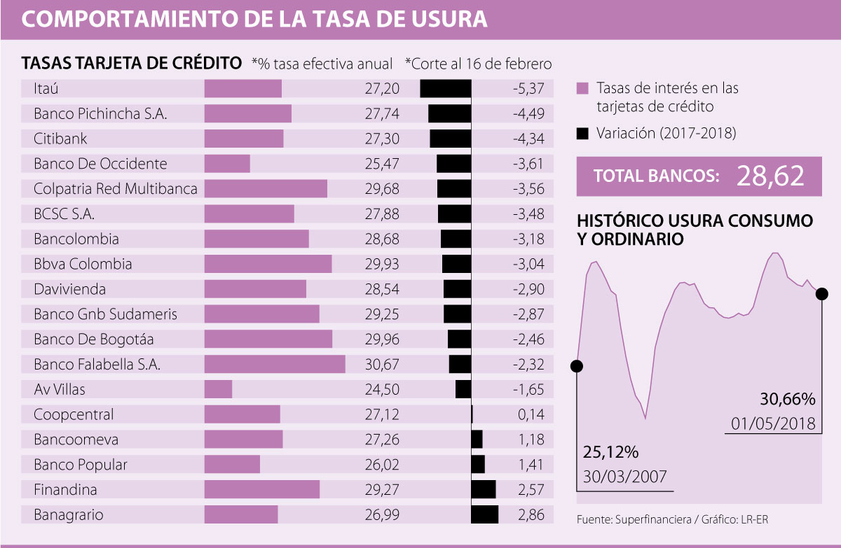 Ahora, al hacer una comparación de los bancos que más han bajado sus tasas frente a la misma fecha del año pasado, se encuentra que las entidades que lideran en la caída son Itaú, con una baja de 5,37 puntos porcentuales a 27,20%, Pichincha con una caída de 4,49 pps a 27,74% y Citibank con 4,34 pps a 27,3%.