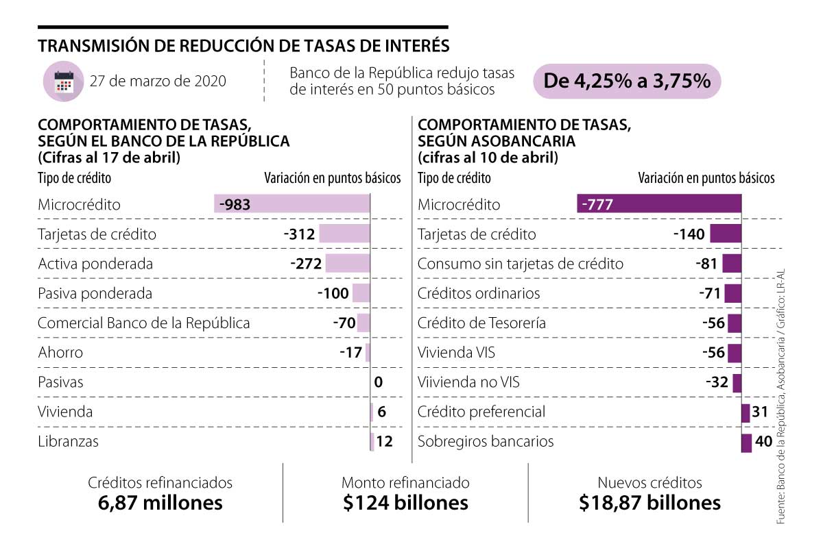 En ese sentido, el presidente de Asobancaria, Santiago Castro, también entregó cifras de la transmisión de la reducción de intereses en sus productos crediticios (solo entre el 27 de marzo y 10 de abril), en las que confirmó que, efectivamente, el segmento de microcréditos y tarjetas de créditos son los de mayores caídas.