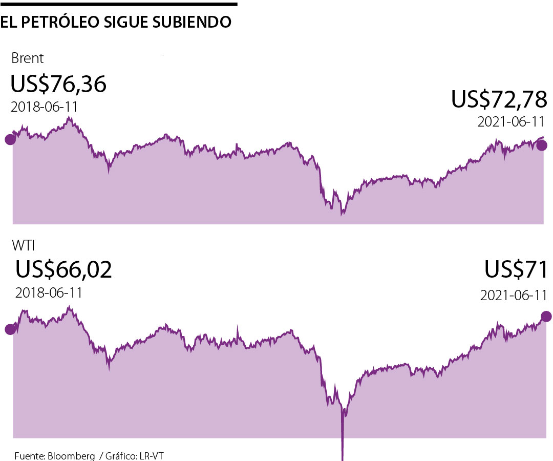 Ayer, el petróleo tocó nuevos máximos en casi dos años. El barril de Brent superó la barrera de los US$73, algo que no pasaba desde el 31 de octubre de 2018, mientras que el West Texas Intermediate (WTI) se cotizó en US$71, un nivel alcanzado en hace más de dos años.