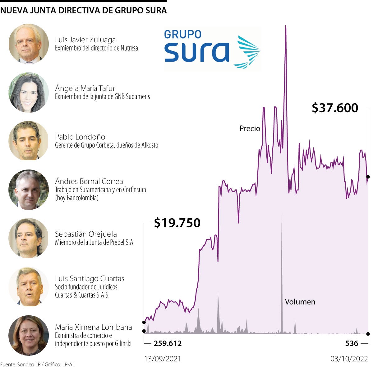 Así las cosas, la nueva Junta Directiva de Grupo Sura quedó conformada de la siguiente manera: Luis Javier Zuluaga, Pablo Londoño, Ángela María Tafur y Andrés Bernal Correa como miembros patrimoniales; y Sebastián Orejuela, Luis Santiago Cuartas y María Ximena Lombana como miembros independientes.