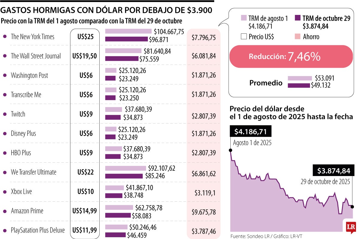 Los gastos hormigas son compras del día a día de productos que no están planificados o servicios que cotizan en dólares, como las suscripciones a medios internacionales o membresías de consolas. Con una TRM de $3.874,84 para hoy, son 7,46% más económicos si se analiza con el precio del dólar a inicios de agosto, que se encontraba en $4.186,71.