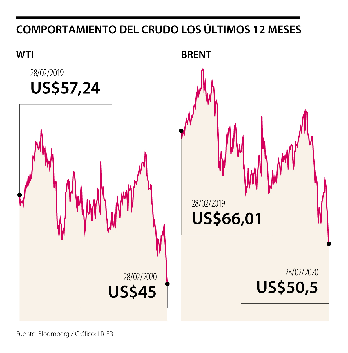 Los precios del petróleo a nivel global siguen a la baja y completaron seis días consecutivos en pérdidas, alcanzando el nivel más bajo desde enero de 2019, con una cotización de US$45 para el barril WTI y de US$50,5 en el Brent, según el cierre de ayer a las 4:00 p.m.