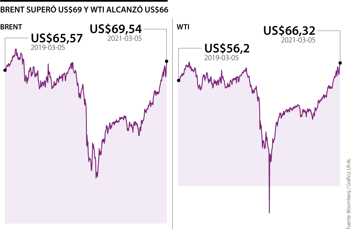 El petróleo vive uno de los mejores momentos en casi dos años y las proyecciones apuntan a que esta situación puede mejorar. Ayer, el barril de Brent se acercó a US$70, cuando alcanzó un precio de US$69,54, un nivel que no tocaba desde el 29 de mayo de 2019. Mientras que el West Texas Intermediate (WTI) alcanzó US$66,32, una barrera a la que no llegaba desde el 23 de abril de 2019. Estos comportamientos se dieron gracias a que en la última jornada el precio del crudo tuvo un incremento de entre 3% y 5%.