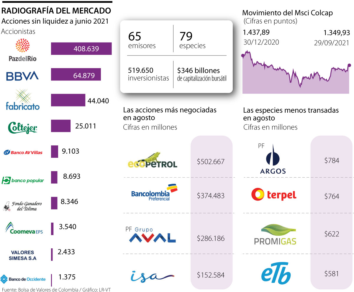 De hecho, pese a que en agosto el volumen negociado en la BVC repuntó 30,48% mes a mes a $2,14 billones, se mantiene en un nivel bajo. Las especies que menos vieron mover capital dentro del mercado fueron Construcciones El Cóndor, con $622 millones, y Cemex Latam Holdings, con $581 millones.