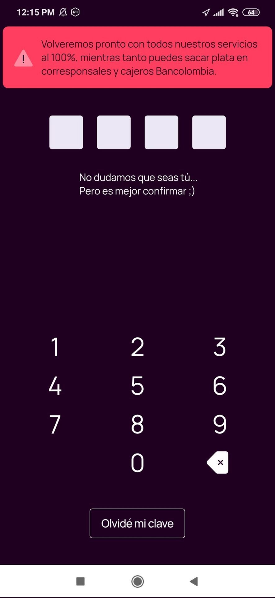 "Volveremos pronto con todos nuestros servicios al 100%, mientras tanto puedes sacar plata en corresponsales y cajeros de Bancolombia", es el mensaje que le arroja a los usuarios cuando intentan utilizar la aplicación.