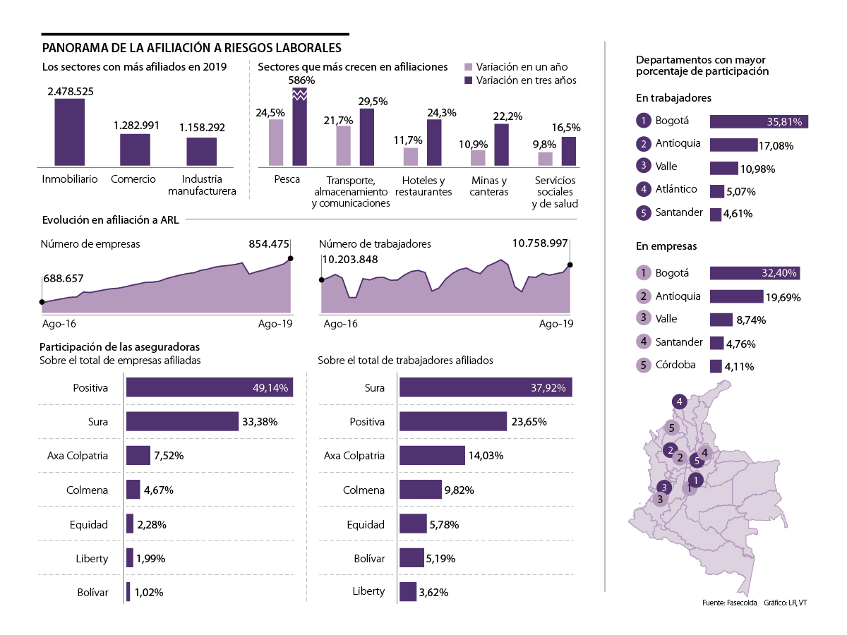 De hecho, las cifras de la Federación de Aseguradores Colombianos (Fasecolda) a cierre de agosto de este año muestran que son 10,7 millones los trabajadores que integran el sistema general de riesgos laborales, frente a un dato de ocupación a nivel nacional de 22,1 millones de personas, de acuerdo con las cifras del Departamento Administrativo Nacional de Estadística (Dane) a agosto.