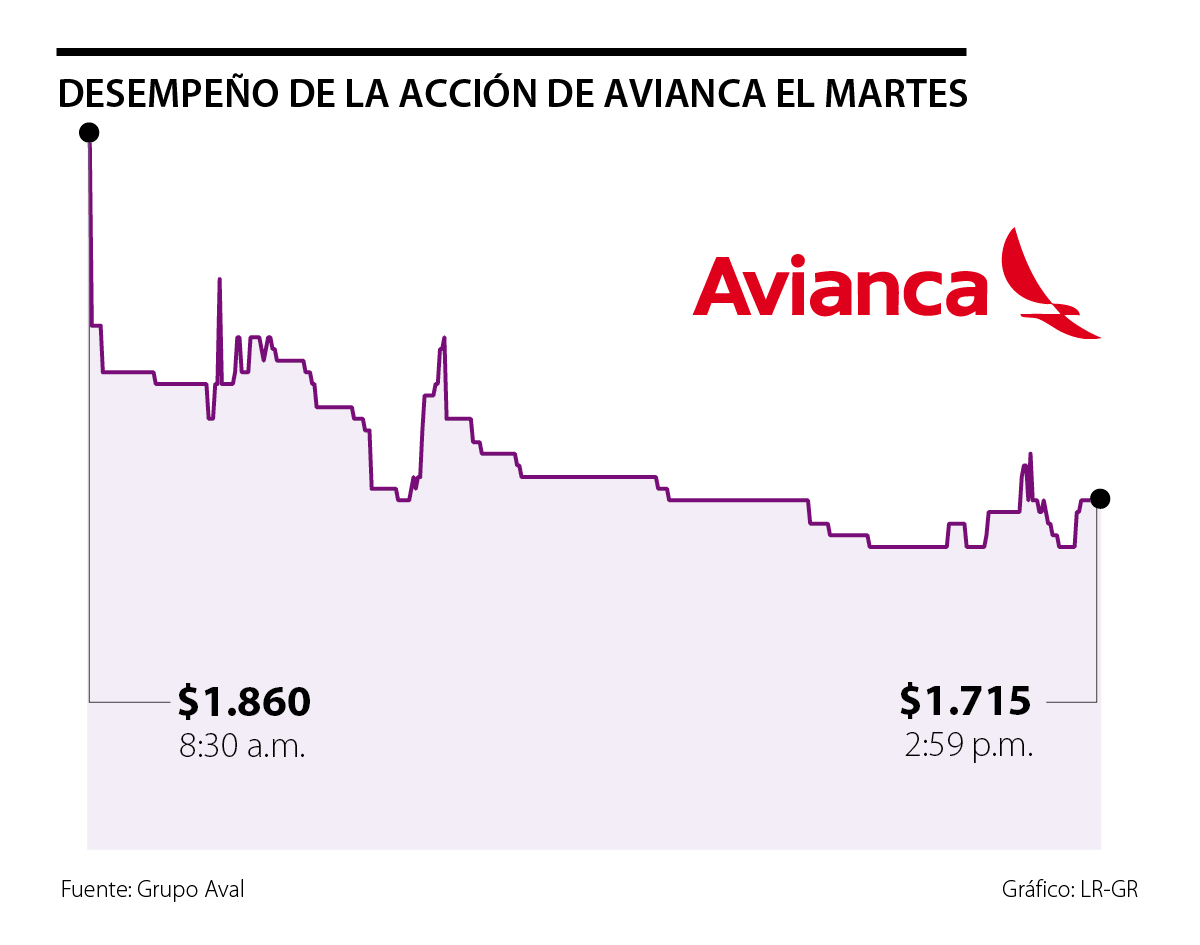 Después de dos jornadas en las que la acción de Avianca recuperó 49,39% de su valor, en la sesión del martes el precio cayó 7,8%.