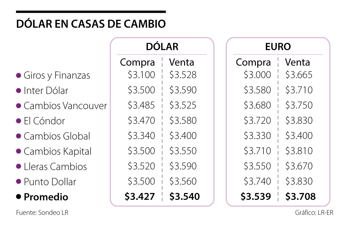 Durante esta semana, las principales casas de cambio del país venderán el dólar a un promedio de $3.540 y lo comprarán a $3.427. En cuanto al euro, los profesionales del cambio consultados lo venderán a $3.708 y lo comprarán a $3.539, en promedio. Cambios Global es la firma que venderá más barato la divisa europea y la estadounidense. Por cada unidad, tanto de dólar como de euro, piden $3.400.