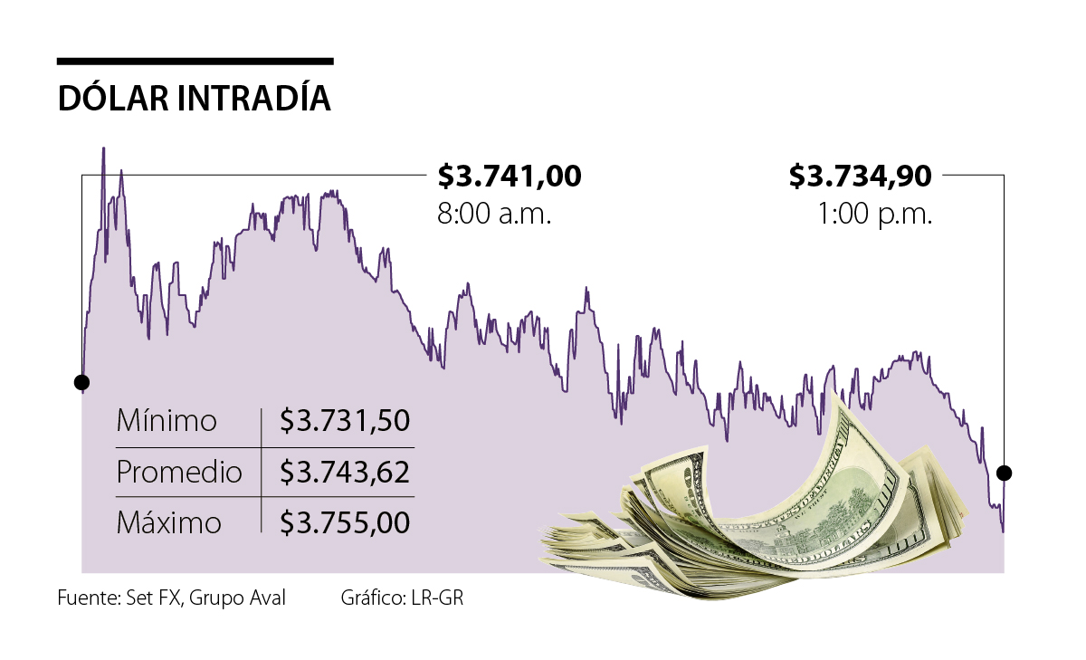 Al cierre del mercado, el dólar alcanzó un precio promedio de $3.743,62, lo que representó un alza de $18,06 frente a la Tasa Representativa del Mercado (TRM), que se ubicó ayer en $3.725,56.