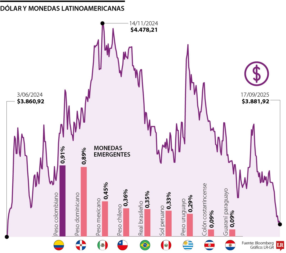 El martes, el peso colombiano fue la moneda más revaluada de la región, además,en lo que va de 2025 el dólar ha perdido $527