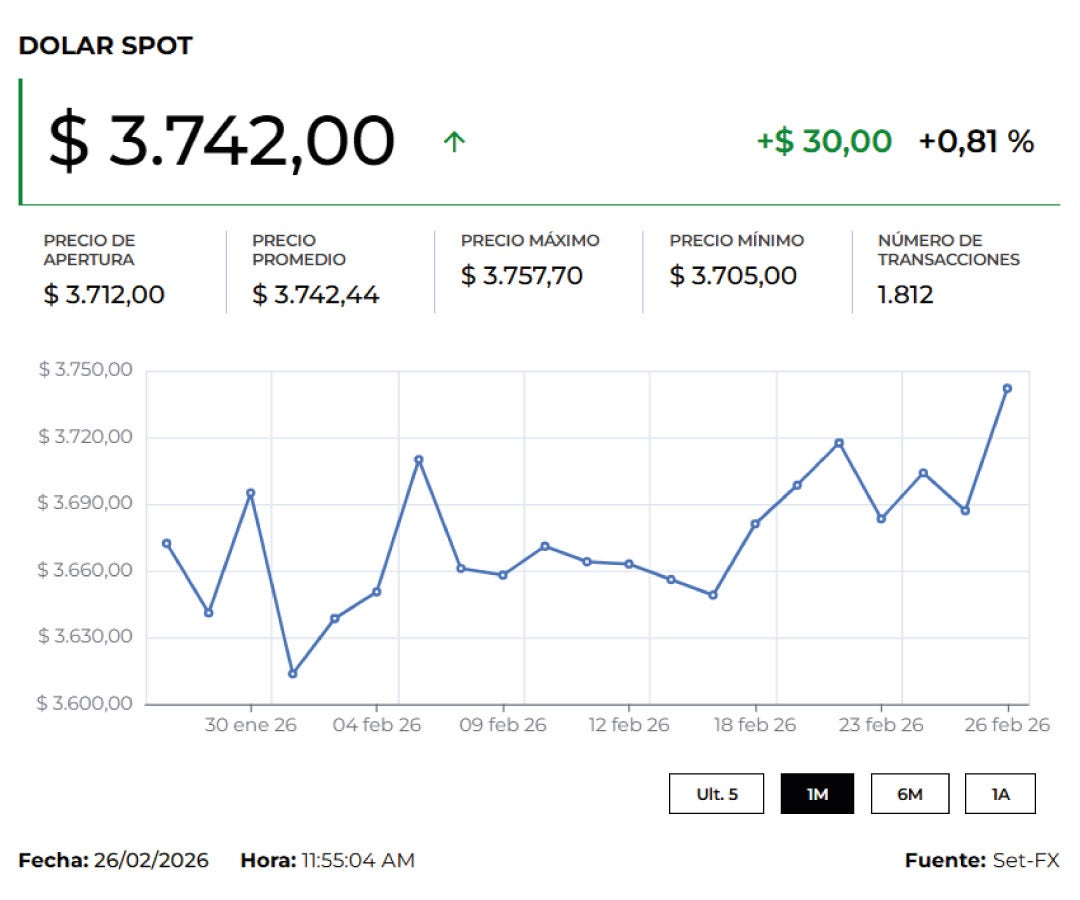 La divisa cotiza la jornada al alza en $3.769,82 sobre las 10:00 a.m., lo que representa un incremento de $24,04 frente a la Tasa Representativa del Mercado (TRM), que hoy se ubicó en $3.745,78. Alcanzó un mínimo de $3.748 y un máximo de $3.784,40, volviendo a niveles similares a los registrados a inicios de año. Hasta el momento se han registrado 727 transacciones por US$468 millones.