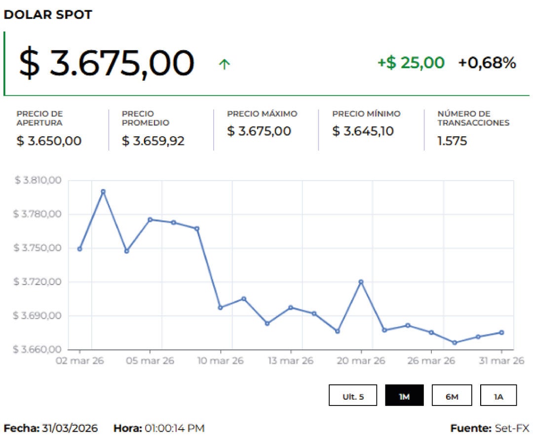 La divisa se cotiza en la jornada al alza sobre $3.693,82, lo que representó un aumento de $33,72 frente a la Tasa Representativa del Mercado, TRM, que para hoy se ubicó en $3.660,10. En la jornada, tocó un mínimo de $3.686,00 y un máximo de $3,706, se han realizado 545 movimientos por un valor de US$316 millones.