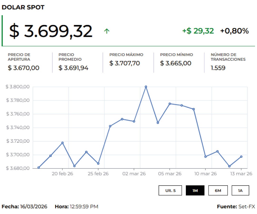 El dólar cotiza la jornada a la baja sobre $3.686.69 lo que representó una caída de $5,21 con respecto a Tasa Representativa de Mercado que para hoy se certificó en $3.691,90. Registró un precio mínimo de $3.680 y un precio máximo de 3.696,50 con 792 transacciones, por $338 millones.