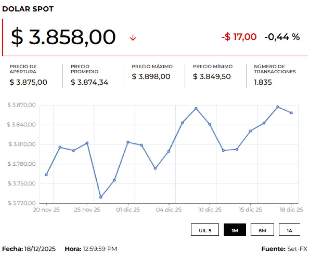 El dólar cotiza en la jornada a la baja en $3.828,31, lo que representó un descenso de $46,4 frente a la Tasa Representativa del Mercado, TRM, que para hoy se ubicó en $3.874,71. Además, la moneda registró un precio mínimo de $3.775 y un máximo de $3.869,95 con 989 transacciones por un monto de US$824 millones.
