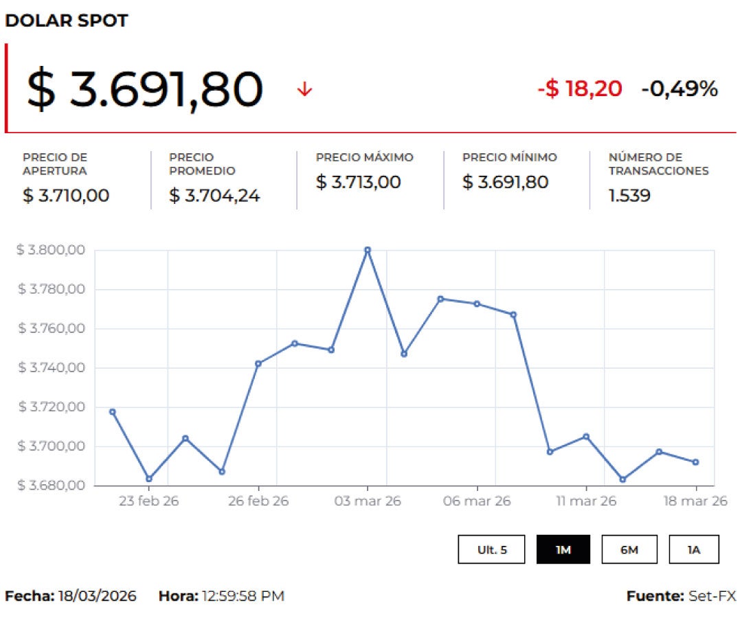 El dólar cotiza la jornada a la baja sobre $3.702,13 lo que representó un incremento de $2,04 con respecto a Tasa Representativa de Mercado que para hoy se certificó en $3.704,17. A las 9:35 registró un precio mínimo de $3.689 y un precio máximo de $3.717,80 con 637 transacciones, por $282 millones.