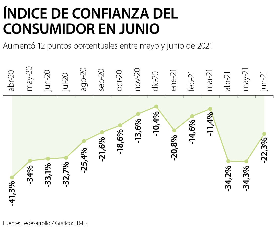 Luego de que en mayo se registrara el peor nivel de confianza de los consumidores en lo corrido del año, Fedesarrollo informó que, en junio, este indicador se ubicó en -22,3%, lo que significó una mejoría intermensual de 12 puntos porcentuales.